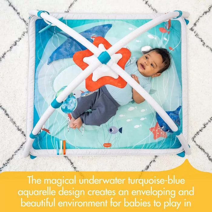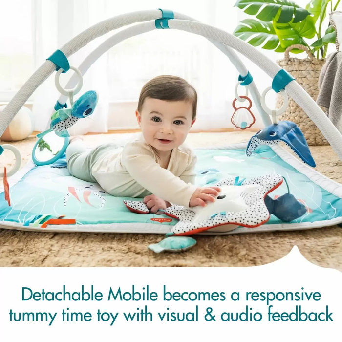 You're after an inspiring and safe environment where your baby can explore and develop. Beautifully designed ocean playmat with 18 engaging activities and 2 modes of use - musical starfish rotating mobile with 6 melodies and a spectacular lights show and responsive tummy time tapping toy.