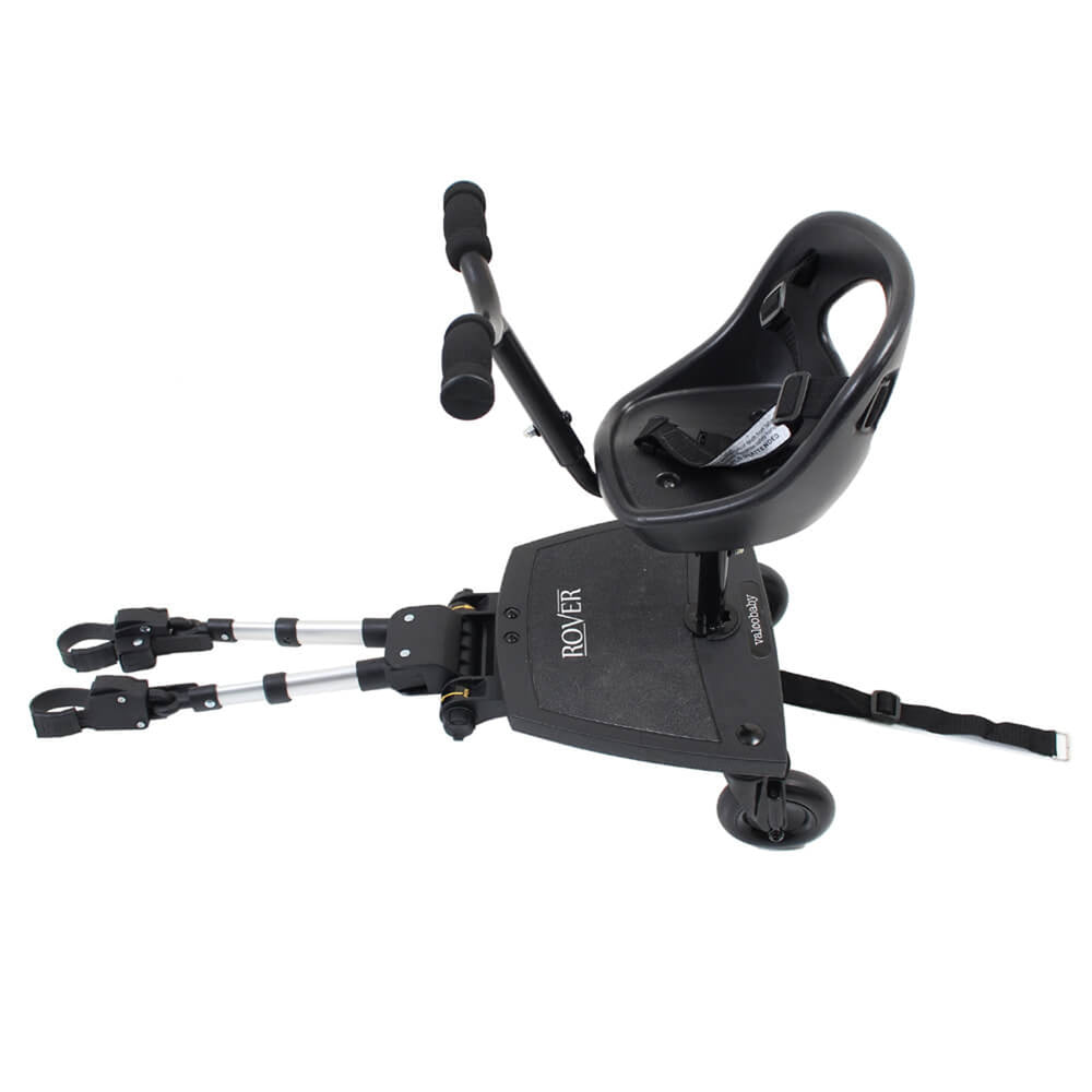 - Your child can sit or stand for the journey with this diverse ride on. The optional seat comes with harness and handlebar for a secure ride. Unlike other ride on boards, the Rover Rider doesn't rely on a break bar or a rear axle to attach to the stroller.
