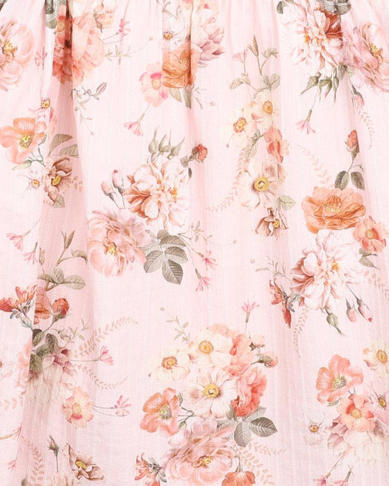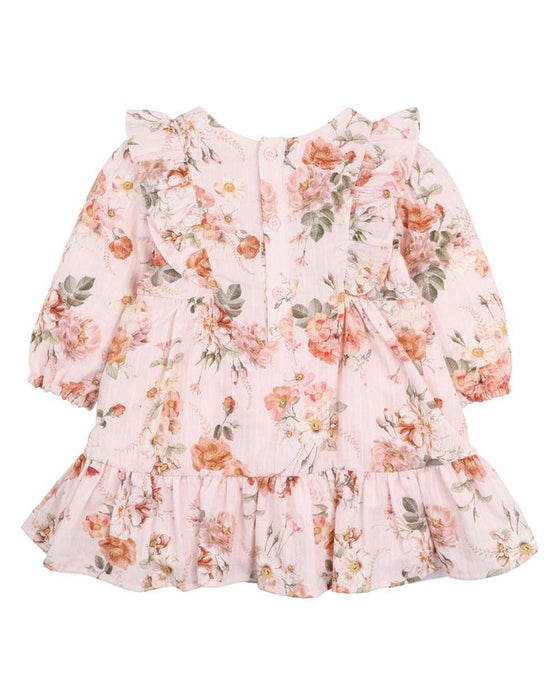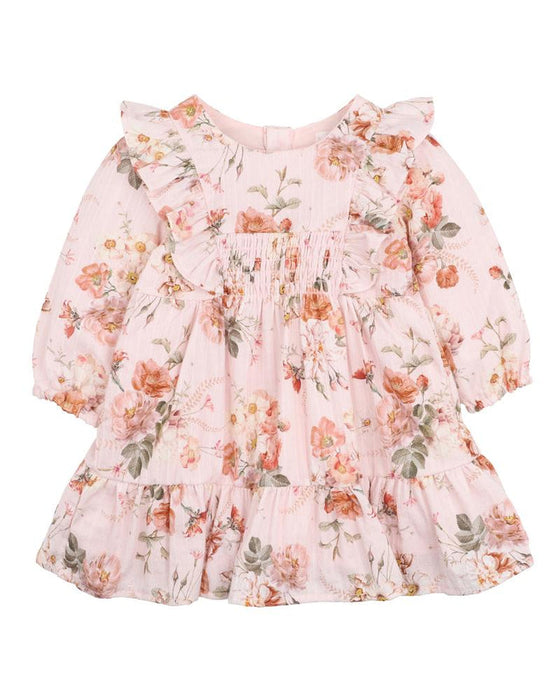 You're after the perfect winter dress for any occasion. This gorgeous floral print dress features over the shoulder frills, a front smocking design, a frilled hem and elasticated cuffs, as well as a back neck button opening to help dress your little one with ease