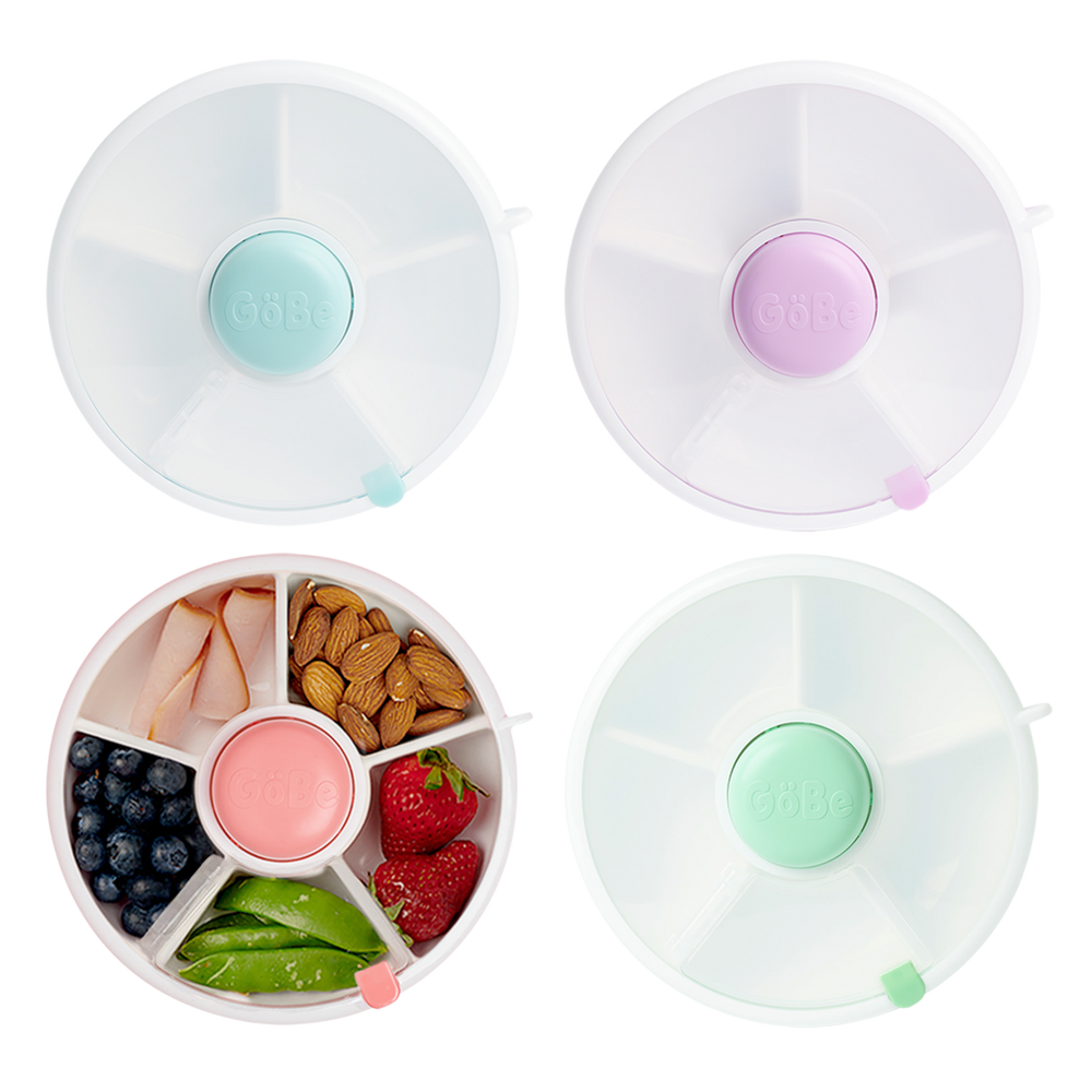 You want to put a new spin on snacks. Featuring a safe, fun, and engaging push button spinner, empower your child’s appetite and learning with this unique design snack container. Utilising a durable food safe construction, this easy to use snack container features a spinnable tray with 5 individual compartments, and spill and leak-resistant flip door lid.