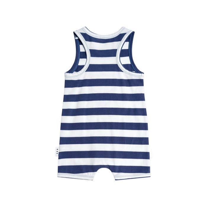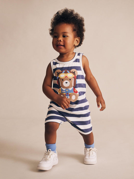 - A marshmallow-soft striped romper with fun and furry pilot Huxbear embroidery. Consciously crafted from premium organic cotton, it has stainless steel snaps at the shoulder and crotch for super snappy dressing. Just add squishy legs.