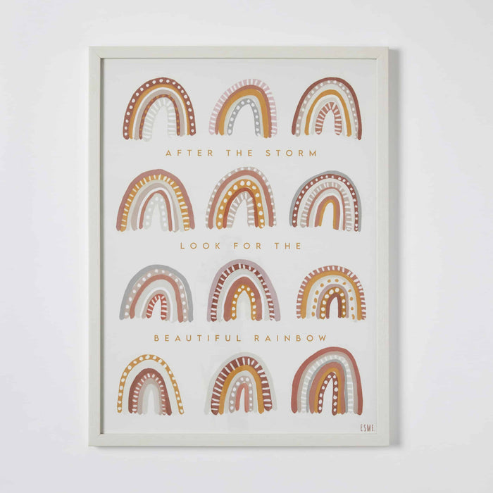 You're looking to decorate the wall of your nursery. This gorgeous wall art picture features painted terracotta rainbow illustrations and an inspirational quote. This print will not only look stunning as wall décor, but can also act as a reminder to always look for the beauty and light in life, as sometimes you have to go through the storm in order to get to the rainbow.