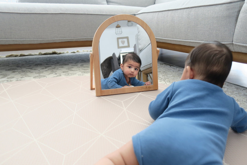 You're looking for a way for your child to develop self-awareness and nurture their social-emotional development. Your baby will begin to recognise that they are seeing their own face in the mirror. Mirrors spark curiosity and motivate your little ones to learn and practice skills such as tummy time, visual tracking, fine and gross motor skills, hand-eye coordination, attention span, sense of self, language and emotional skills.