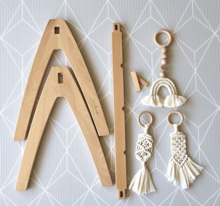 You're after a toy bar that has been designed with physical and cognitive development in mind. Made from beautifully crafted solid beech wood. Each toy bar includes a three piece bespoke macrame toy set, made with soft cotton.