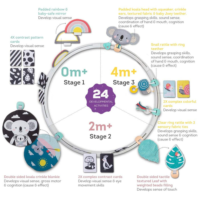 • 24 developmental activities - sensory detachable toys - Featuring rainbow baby safe mirror and four felt art cards, round double-sided koala soft panel with crinkle filling and a weighted textured leaf filled with plastic beans, rattle ring with string ties, snail rattle with teether and a cushiony squicking plushed koala toy with a fluffy fabric, crinkle, ribbons and a baby teether. Playing with the hanging toys encourages baby’s senses development, fine and gross motor skills and eye-hand coordination