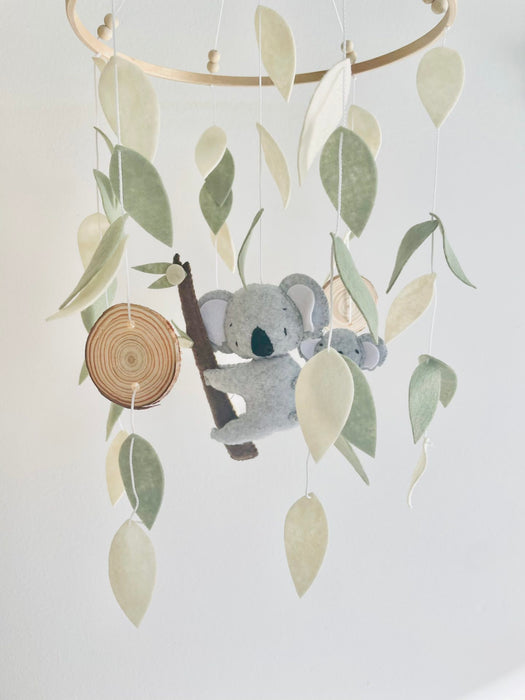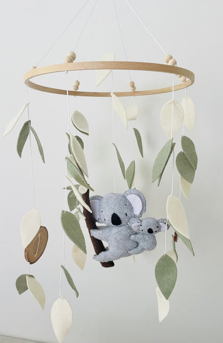 You're creating an Australian themed nursery. These dream nursery mobiles are the perfect addition to every nursery. They are handmade from gorgeous felt. It features real round wood, colourful leaves and cut mama & baby koala in the middle.